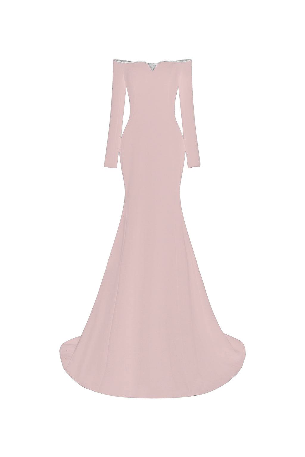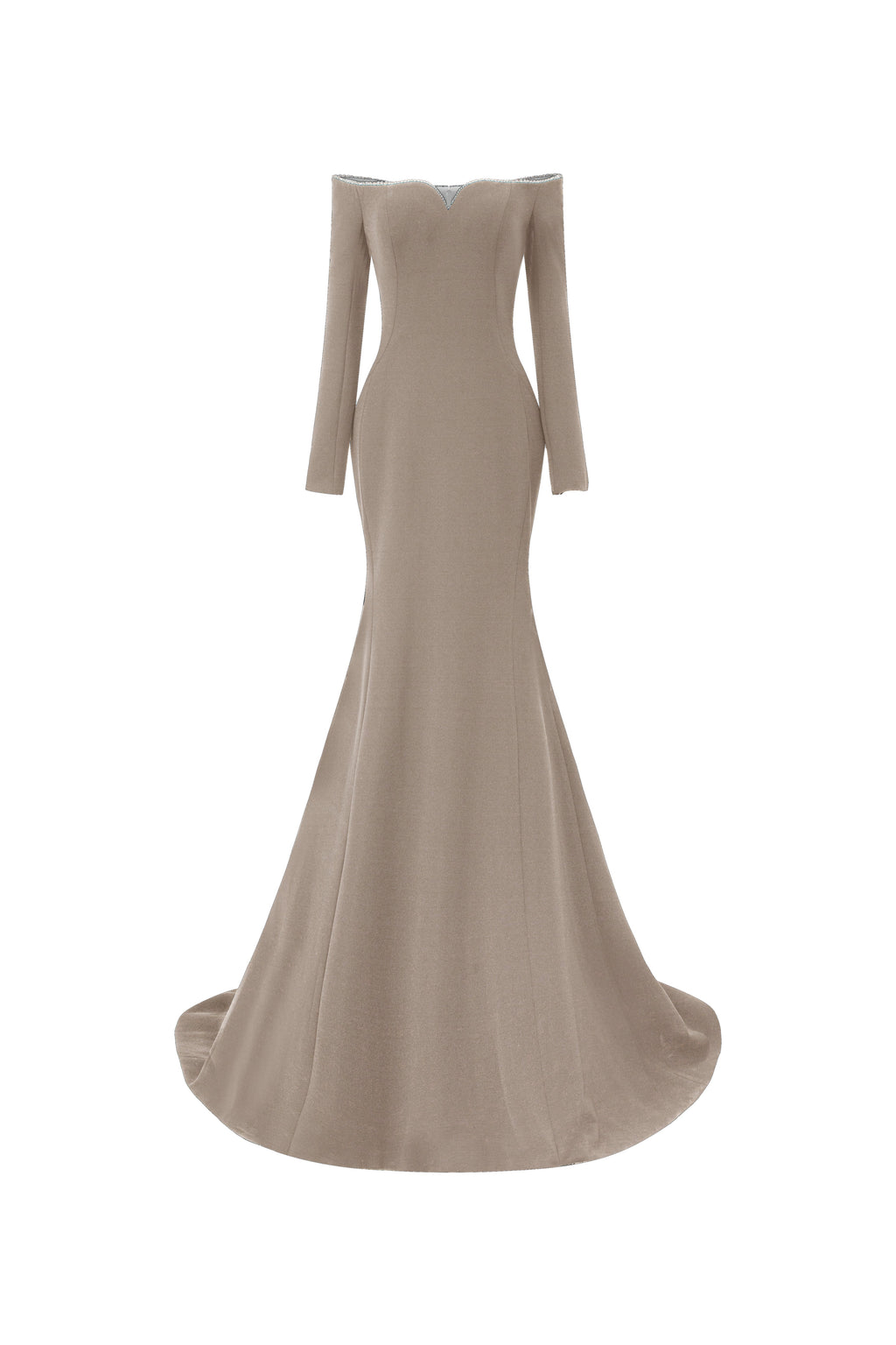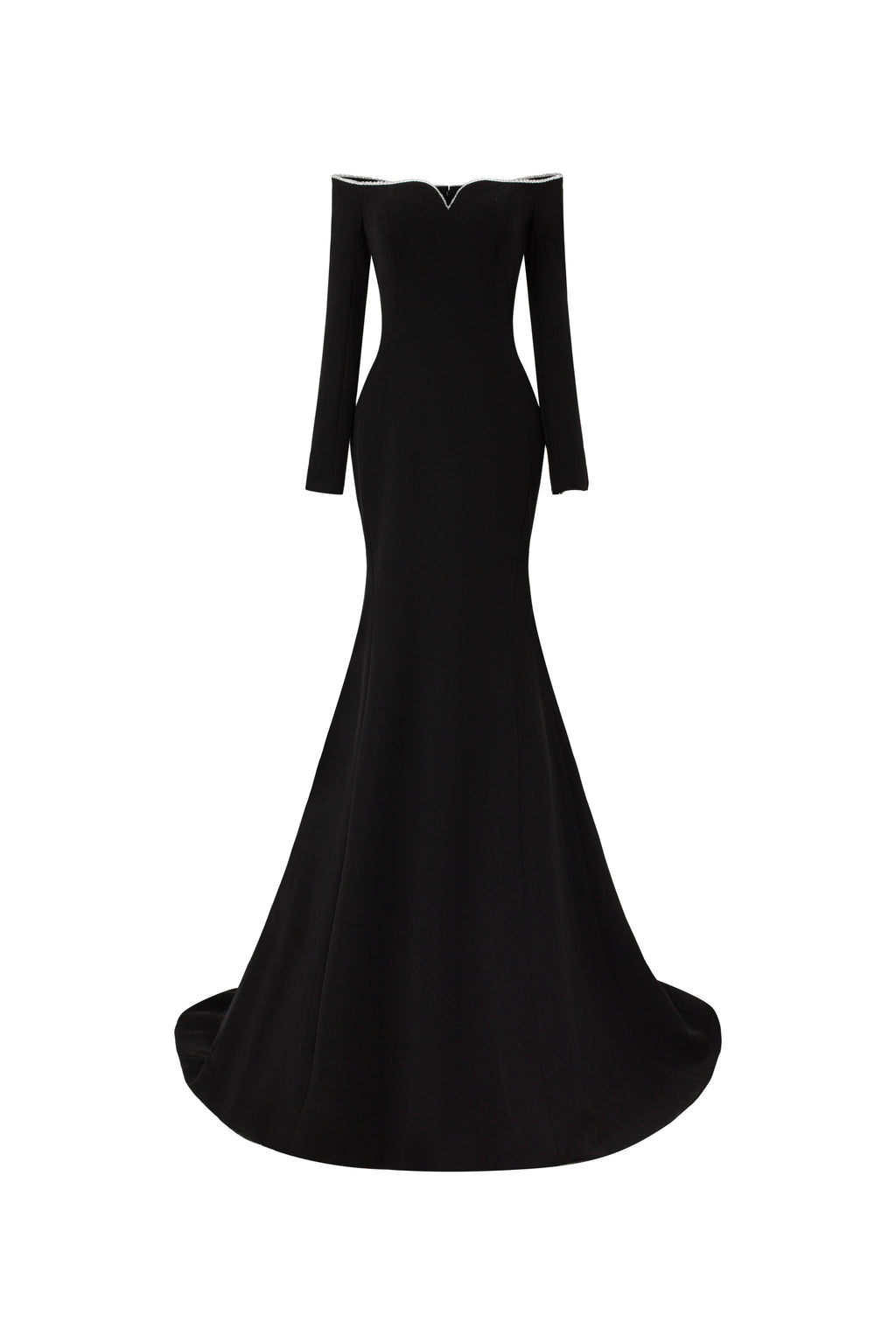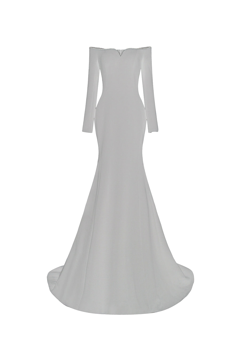 Off-shoulder, long-sleeve mermaid gown in crepe, featuring a softly contoured neckline. The neckline is adorned with a shimmering crystal trim, offering a refined and elegant highlight.