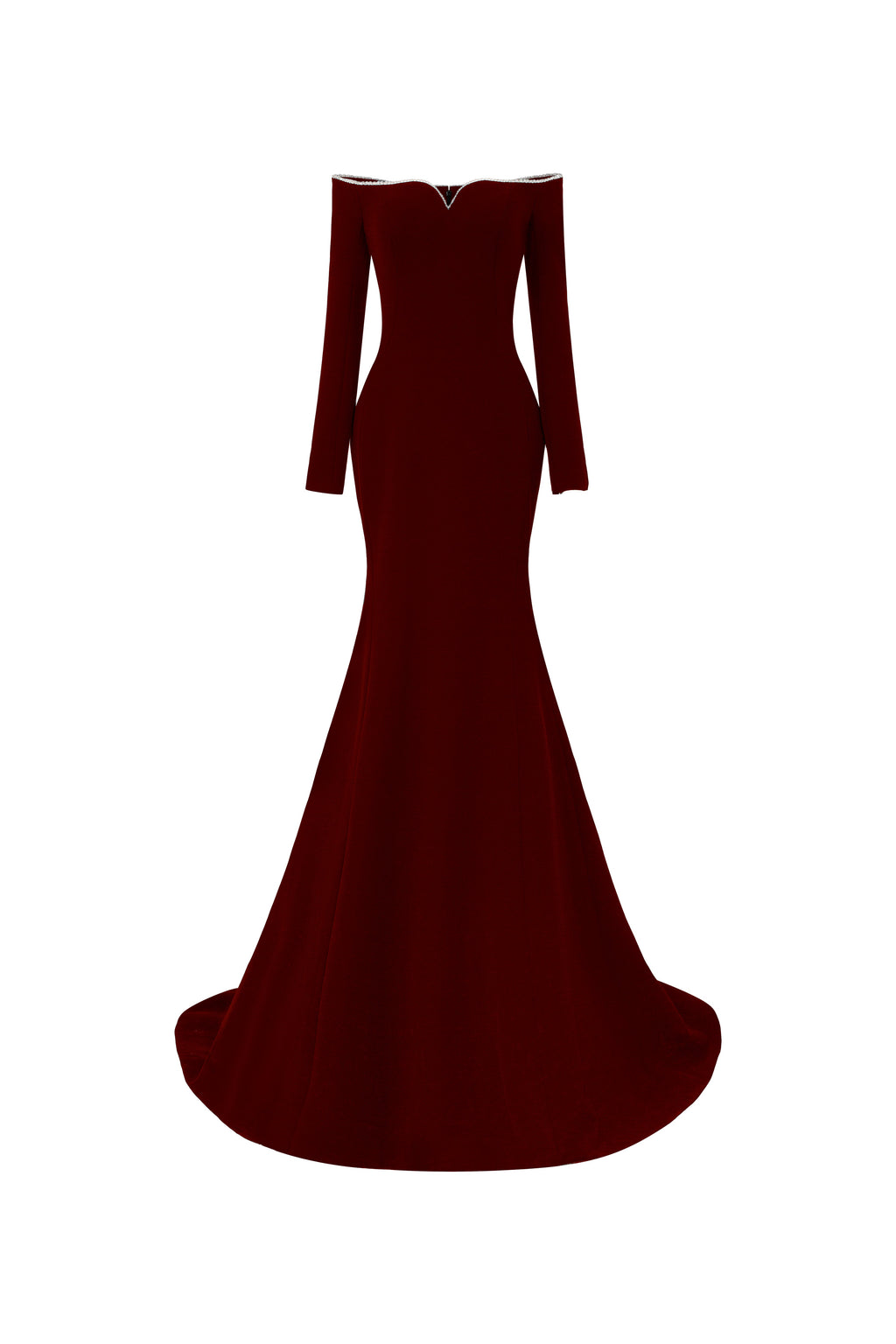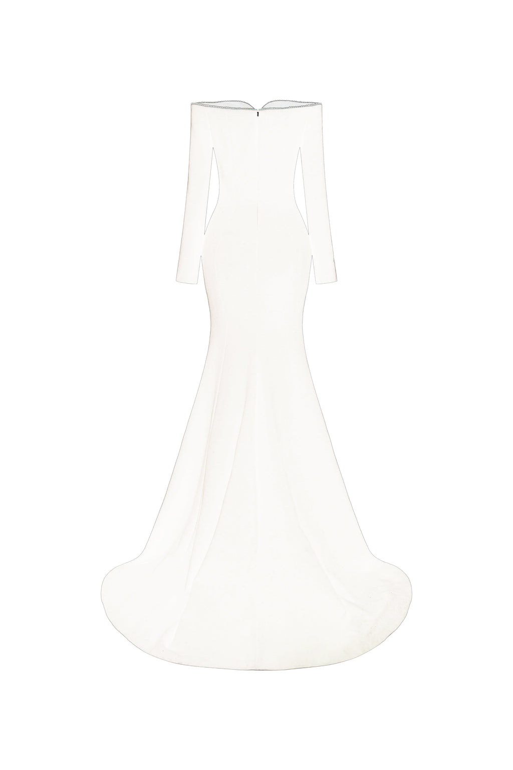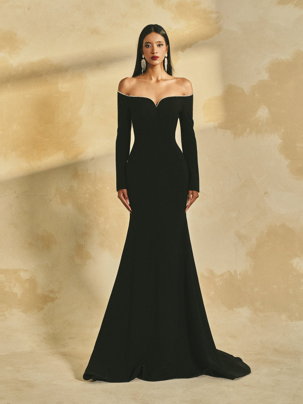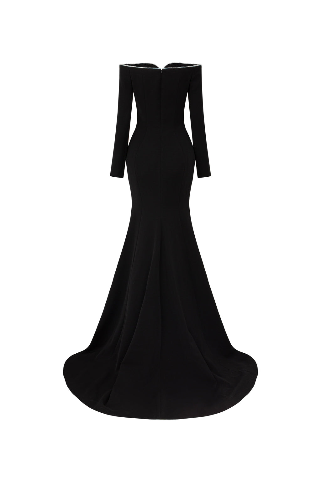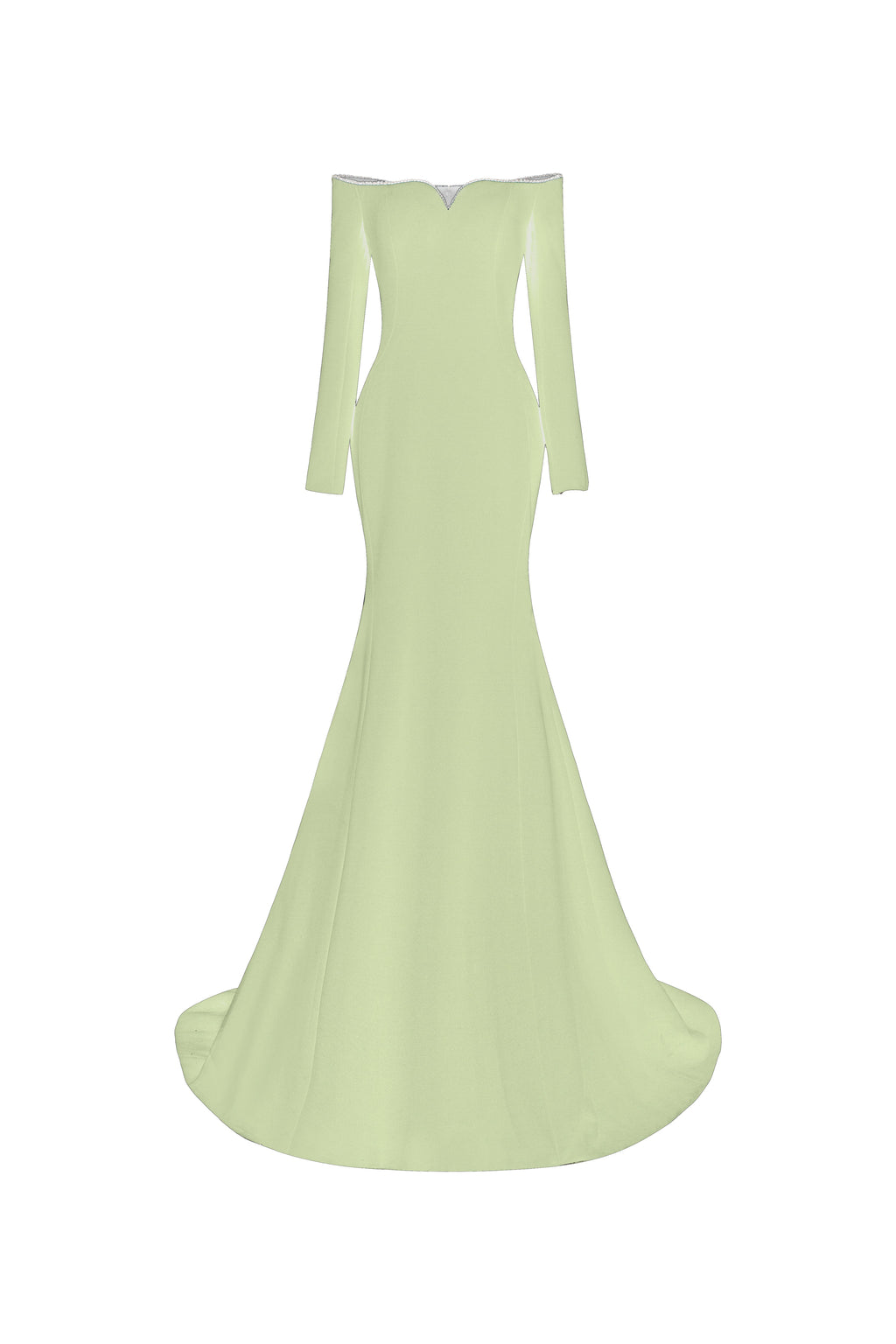 Off-shoulder, long-sleeve mermaid gown in crepe, featuring a softly contoured neckline. The neckline is adorned with a shimmering crystal trim, offering a refined and elegant highlight.