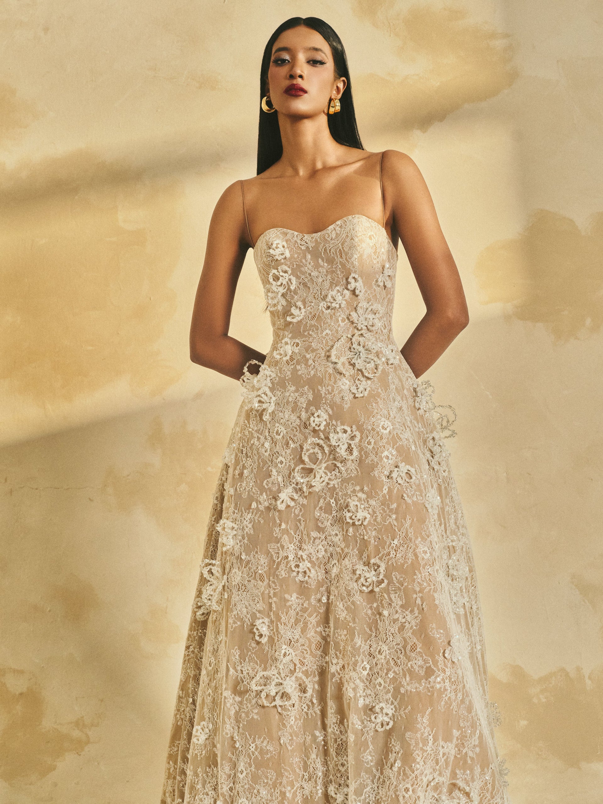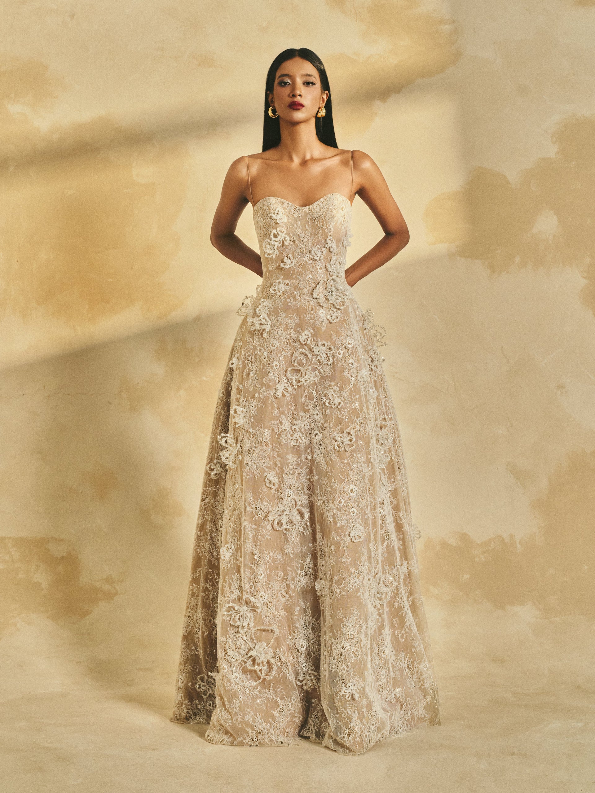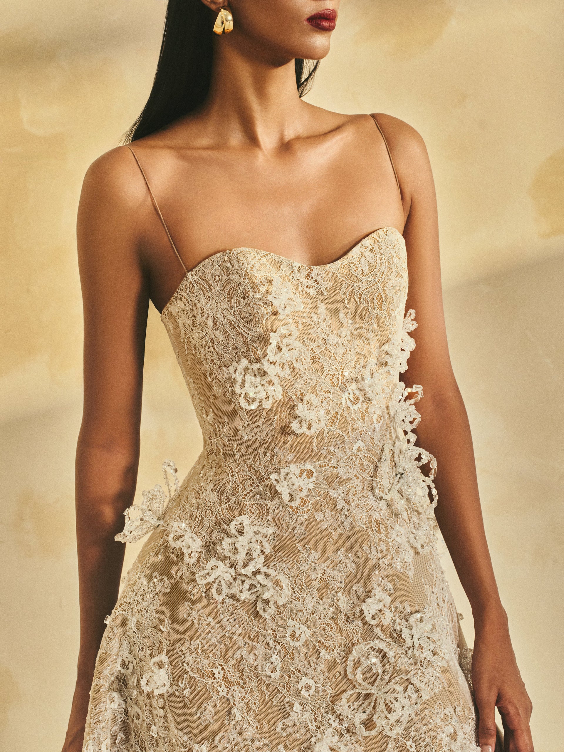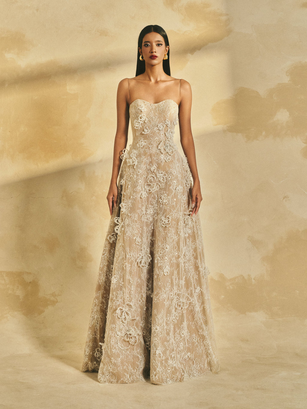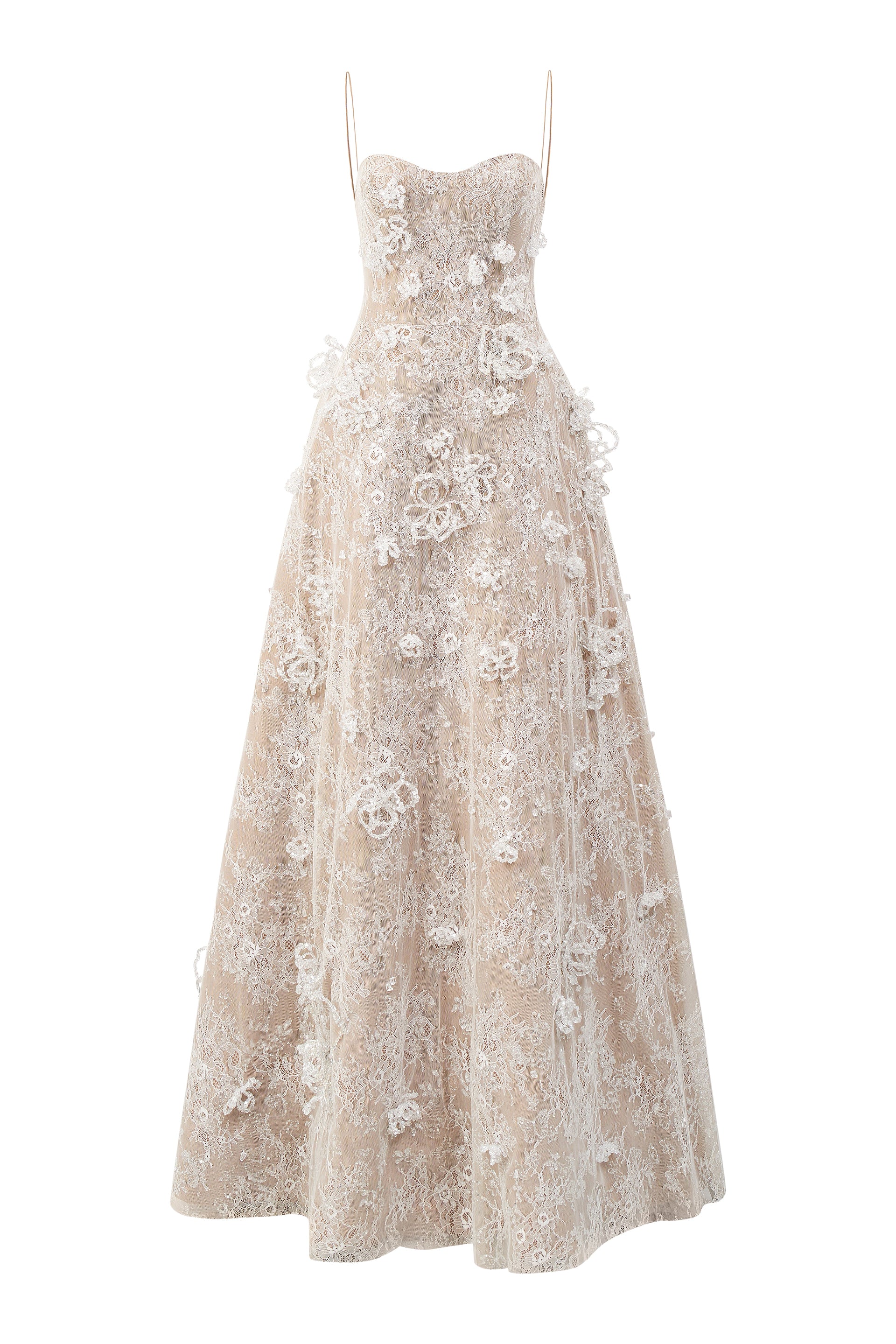 Gitter lace A-line maxi dress with delicate shoulder straps and a softly contoured neckline. The gown is adorned with handcrafted 3D crystal flowers, adding a touch of refined elegance and artisanal detail.